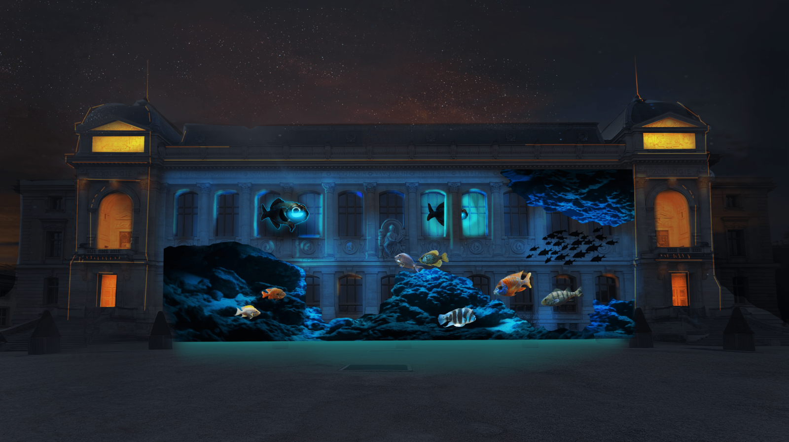 Un video mapping di 440 m² sulla facciata della Grande Galerie de l’Évolution porta i visitatori negli abissi oceanici. Qui, creature bioluminescenti — stelle di mare, pesci-phare, meduse — danzano in uno spettacolo marino di pura poesia.